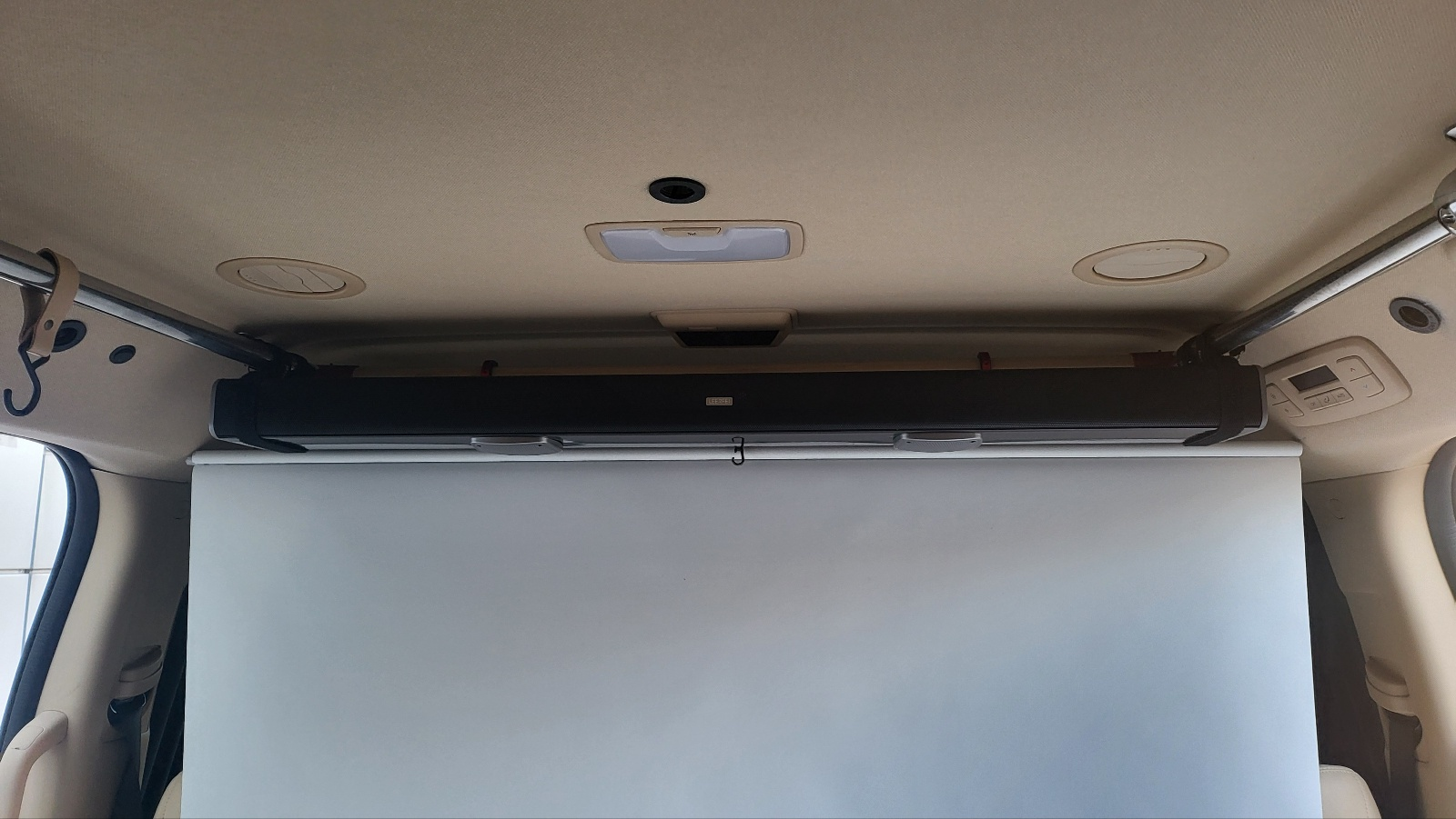 개요 60인치 족자형 빔 스크린을 차량 1열 뒤 거치 . 커튼 용도로도 활용가능. - 족자형 스크린 감은 상태에서 고정하는 수단으로 키친타월 걸이 활용. 매우 유용. 작업 방법 상세 다이소