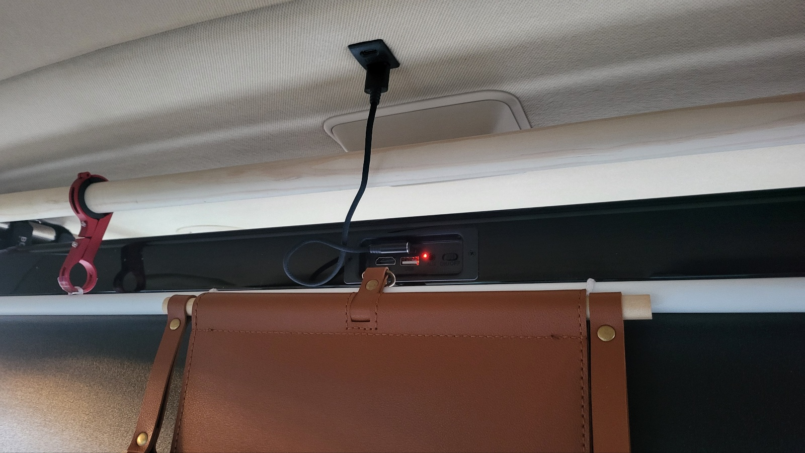 - 천장에 구비해둔 usb 커넥터 (작업 상세보기 )로 연결해두고 전원 스위치 켜둬서 상시 충전해두고 항상 작동 가능 상태로 해둔다. 본체 스위치 켜둬도 리모컨으로 사운드바 on/off 제어 가능. 아래 사진 붉은색 LED는 충전 중 표시.
