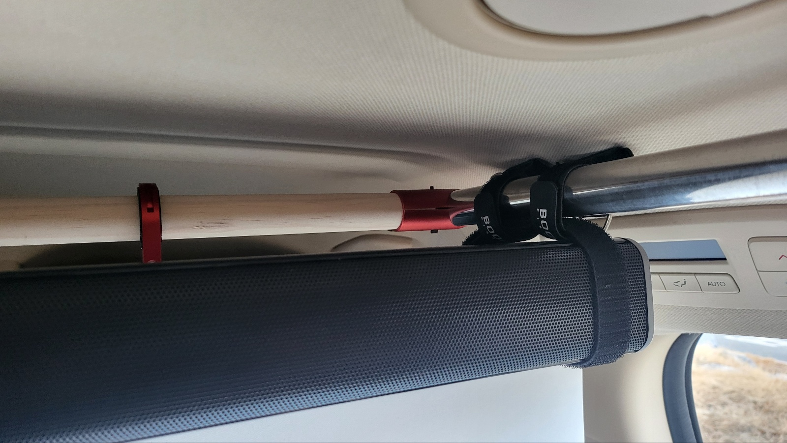 - 사운드바 양쪽에 벨크로 타이 감고 , 봉에 결합위한 벨크로 밴드(낚시대 거치용으로 주로 사용하는 것) 를 아래 사진처럼 준비한다.