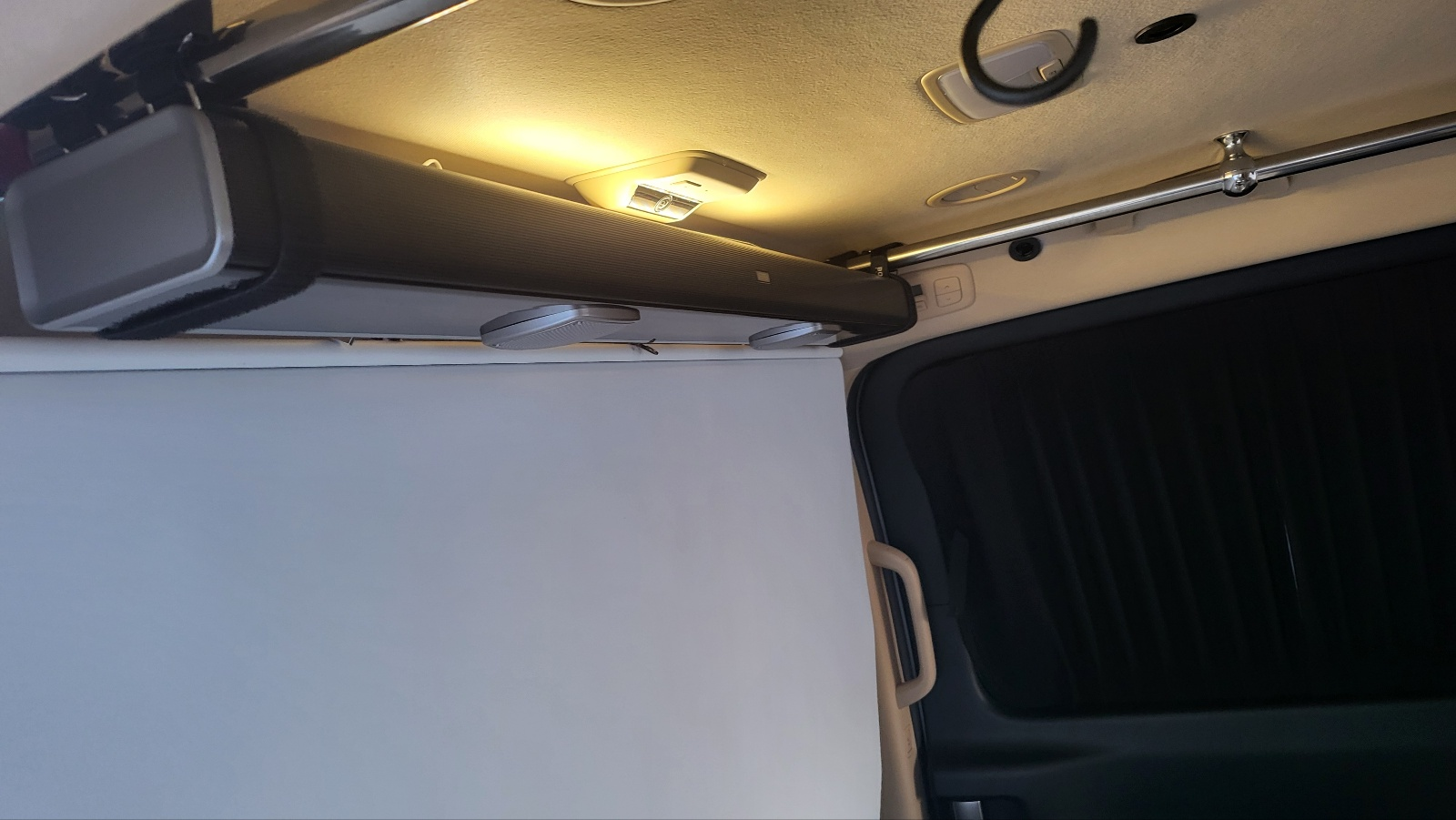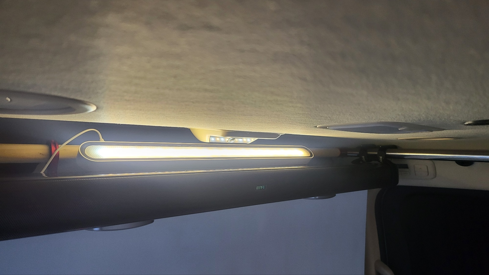 LED 실내 천장 간접조명 - 1열 뒤 천장에 장착해둔 사운드 바 상단(작업 상세보기)과 측면 천장 세로봉위에 LED 조명 장착 하여 간접 조명 구현 스위치 위치 : 사이드도어 열면 손이 닿을