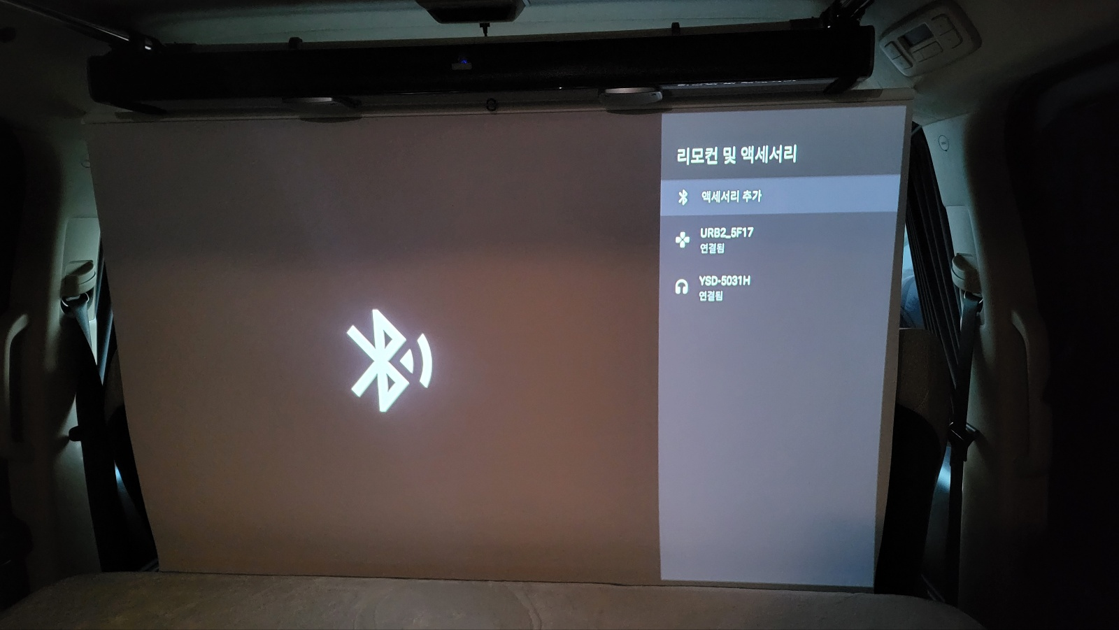 - 차량 천장에 셋팅해둔 빔 프로젝터 (작업 상세보기)에서 블루투스로 사운드 바 연결하고, 유튜브 실행하여 음원 출력 시험.
