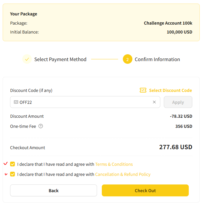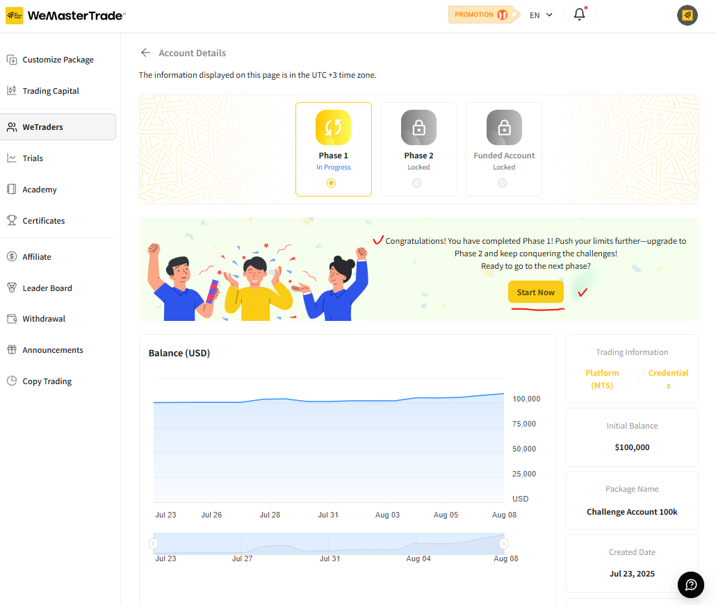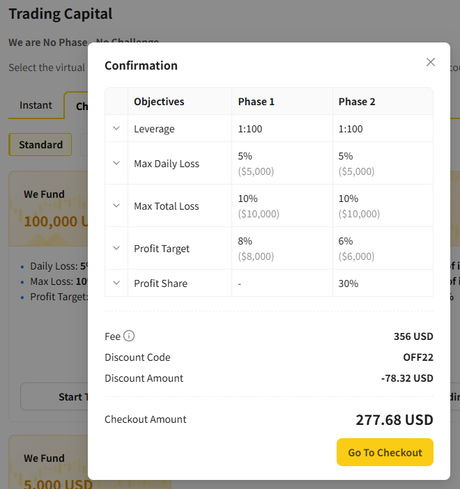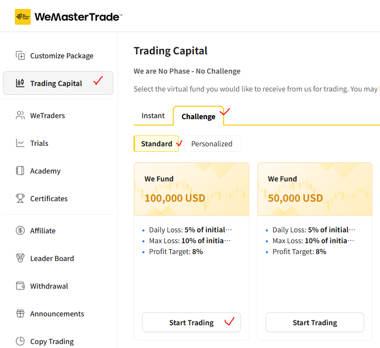WMT 에 본인 계정으로 로그인하여 보이는 화면 왼쪽 메뉴 "Trading Capital" 선택하고 오른쪽 화면에서 Challenge 선택 , Standard 선택 , 계좌액수 100,000 USD 선택 .
