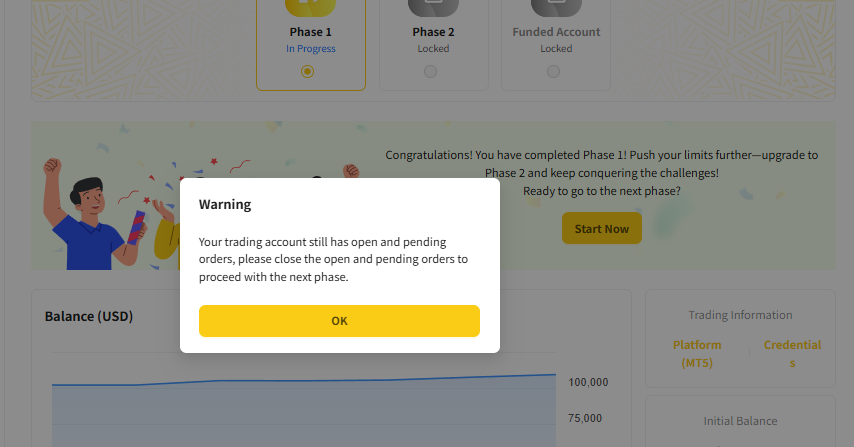 MT5 에서 포지션 및 주문들 제거하고 Start Now 클릭하면 아래 화면처럼 단계2 개시된다.