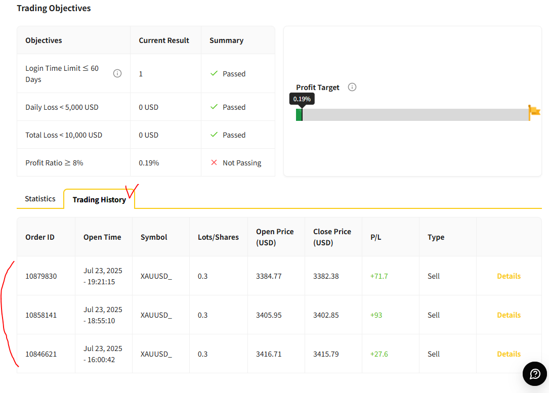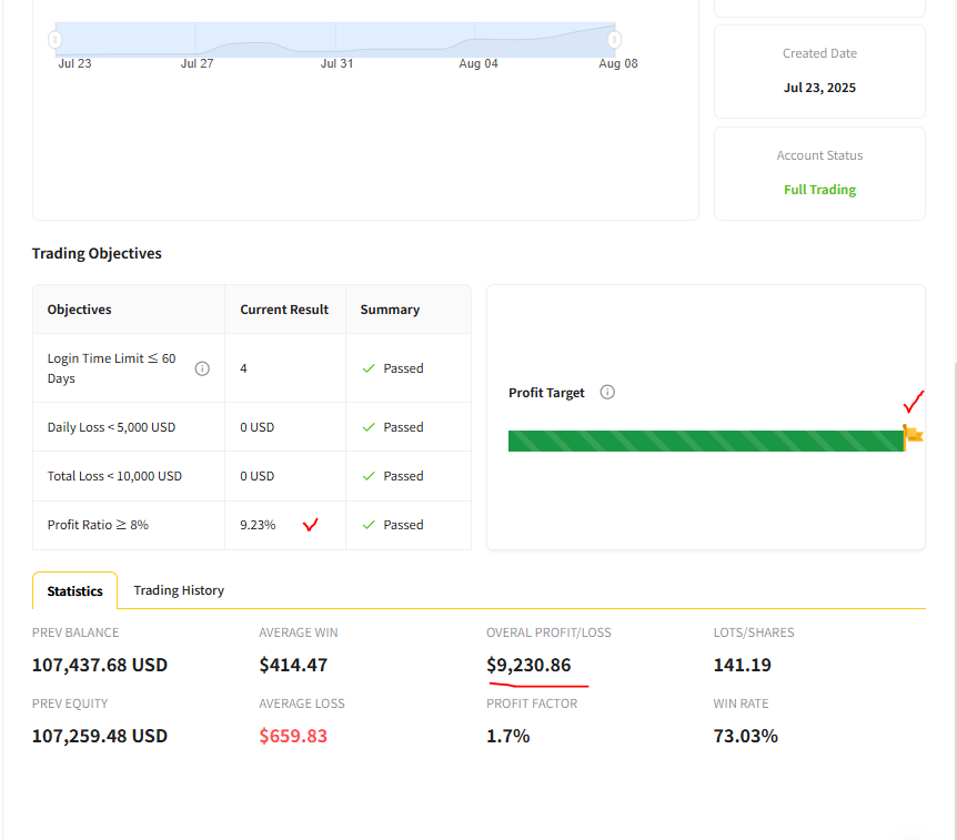 - 수익률 8% 이상 달성하면 아래 화면 처럼 Trading Objectives 항목들 모두 Pass 상태로 표시되고 다음 단계2 진행할 자격 주어진다. 2025년 8월 8일.