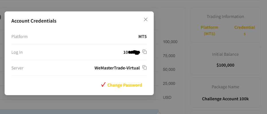 위 화면의 오른쪽에 노란색 글자 " Credentials" 클릭하면 MT5 계좌 아이디를 보여주며 비밀 번호는 노란색 글자 "change password" 클릭하여 본인이 직접 지정한다.