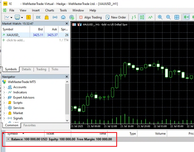 MT5 의 Balance 에 10만 달러 입금 되어 있는 것을 확인할 수 있다.