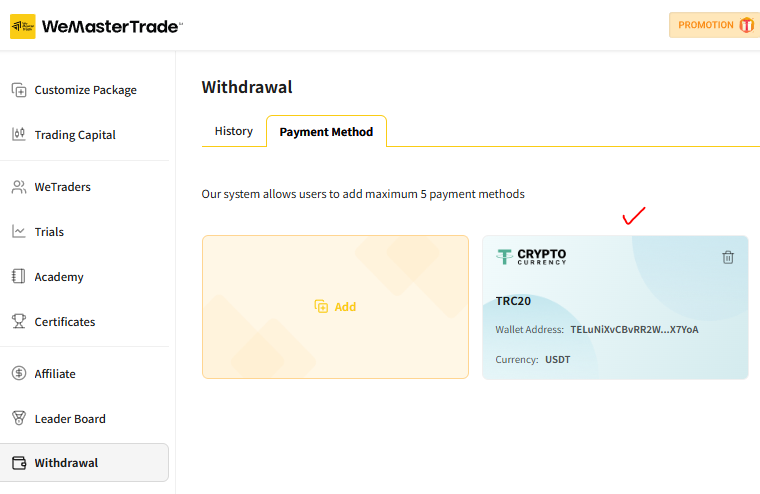 WMT ( 프랍펌 WeMasterTrade ) 에 로그인 하여 보이는 화면의 왼쪽 메뉴의 Withdrawal -> Payment Method 클릭하면 출금 수단 추가할 수 있다.