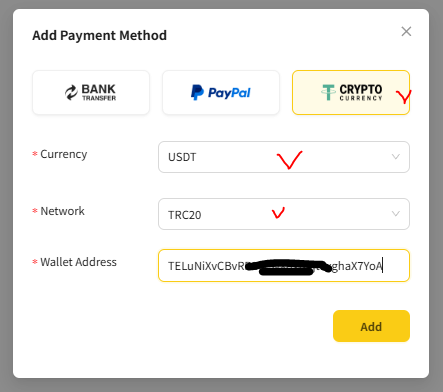 WMT 수익 출금 위한 암호화폐 USDT 주소 등록하기