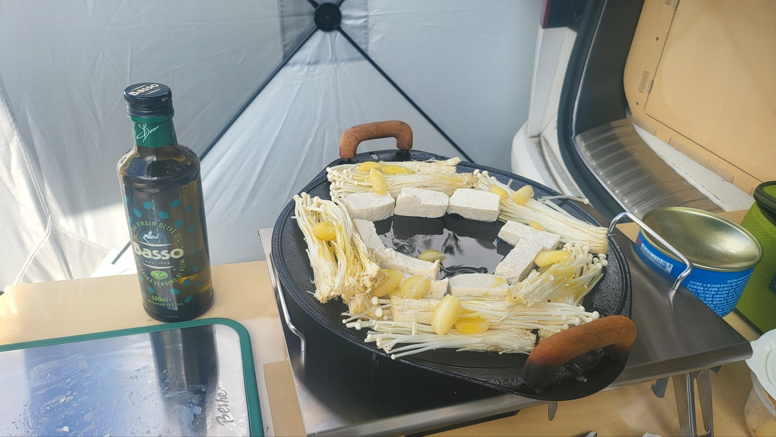 - 무쇠 그리들에 올리브유 + 팽이버섯 + 두부