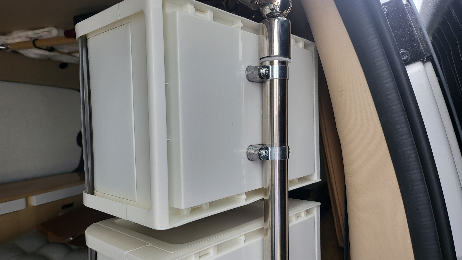 차량 사이드 도어 인접하여 수직 봉 장착 제작 방법 침상키트 바닥 부분에 파이프 발 장착, 파이프 발 속으로 파이프 고정되고 상판에 25mm 홀 가공하여 파이프 관통 가능하게 해둔다.