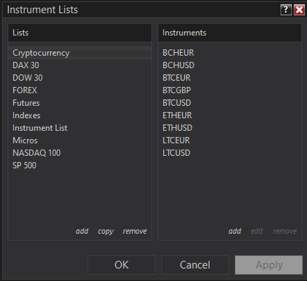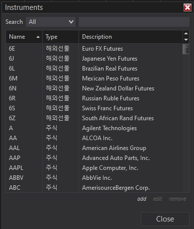 메뉴 : Tools - Instruments 와 Instrument Lists 에서 종목들을 볼 수 있다.