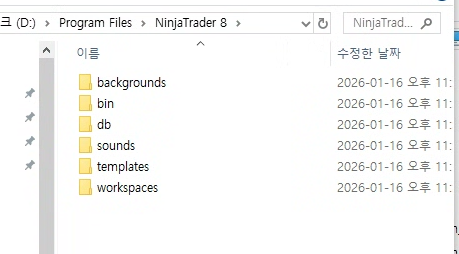 위 설치 경로 외에 추가로 문서 쪽에도 아래처럼 NinjaTrader 8 폴더 만들어져있다. 용량 110Mbyte