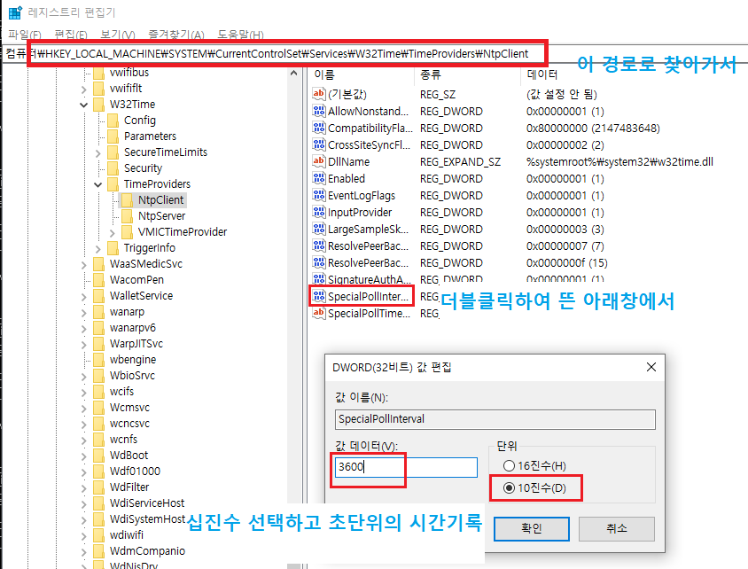 regedit 실행하여, 아래 그림의 설명대로 설정하면 PC 시계동기화 간격을 사용자 지정가능하다.