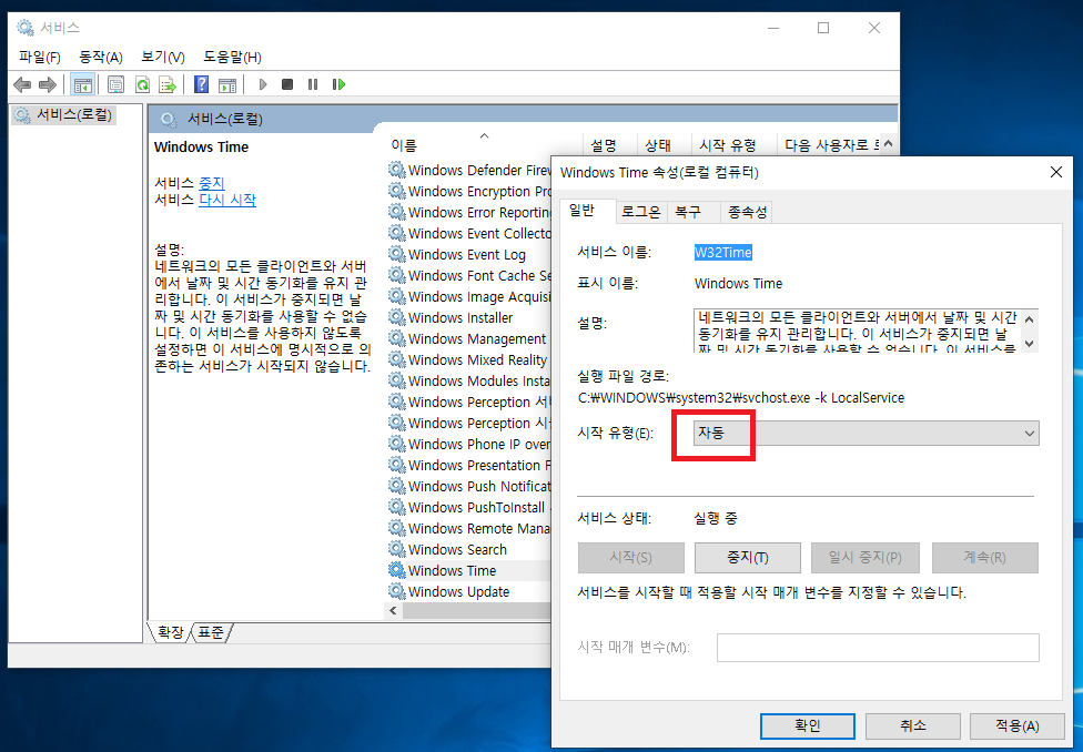 중요 : 아래 창에서 시작 유형 이 자동으로 되어있어야 PC 재부팅시에도 시간동기 작동한다. 수동으로 되어있다면 자동으로 변경할것.