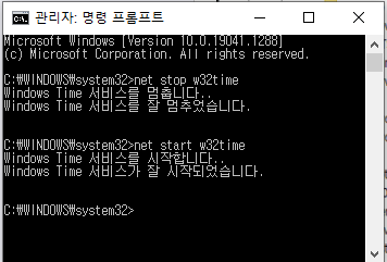 위와같이 커맨드 창에서 재 시작 시켜도 되고, 아래처럼 서비스 항목중 Windows Time 속정창에서 중지 시켰다가 시작 시켜도 된다.
