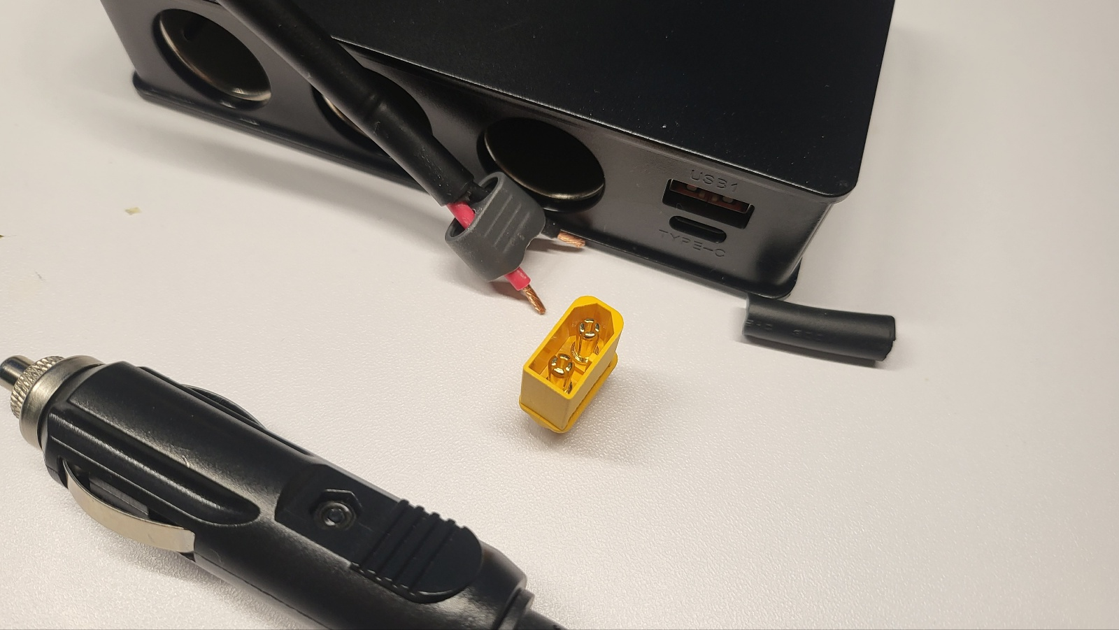 - 차량에 구비된 인산철 배터리 연결 수단이 XT60 커넥터로 되어있고, 부피 큰 시거소켓 거쳐서 연결하는 것보다는 훨씬 사이즈가 작은 XT60 커넥터 수컷 장착하여 연결하기로 함.