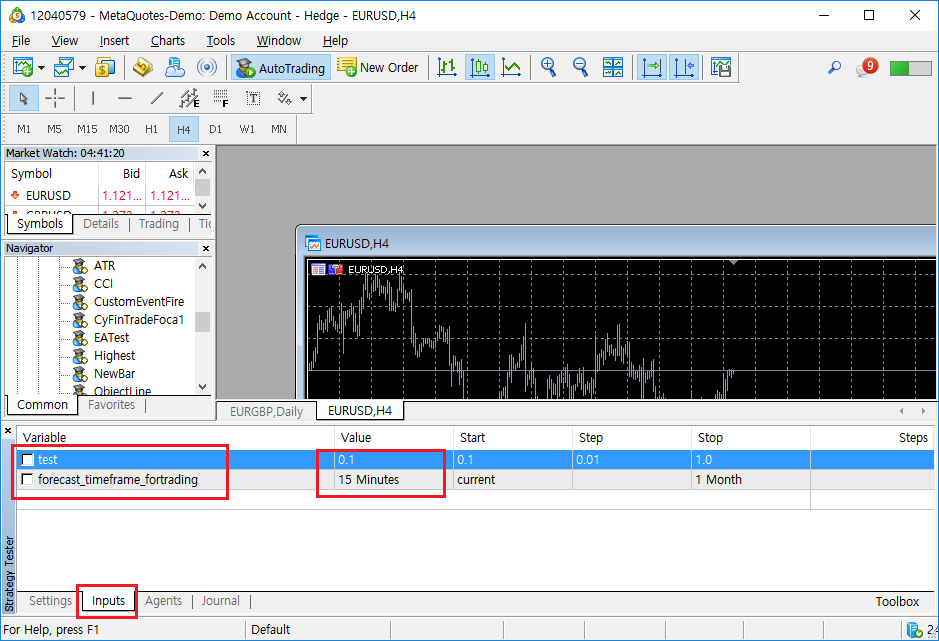 코드에서 input 으로 설정된 변수들은 ea 의 속성창에서 사용자가 값 변경 가능. strategy tester 에서는 아래 위치에서 사용자가 값지정 가능.