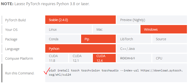 https://pytorch.org/get-started/locally/  에서 PyTorch 설치 옵션을 선택하면 설치 실행구문을 보여준다(아래 화면의 체크한 부분).