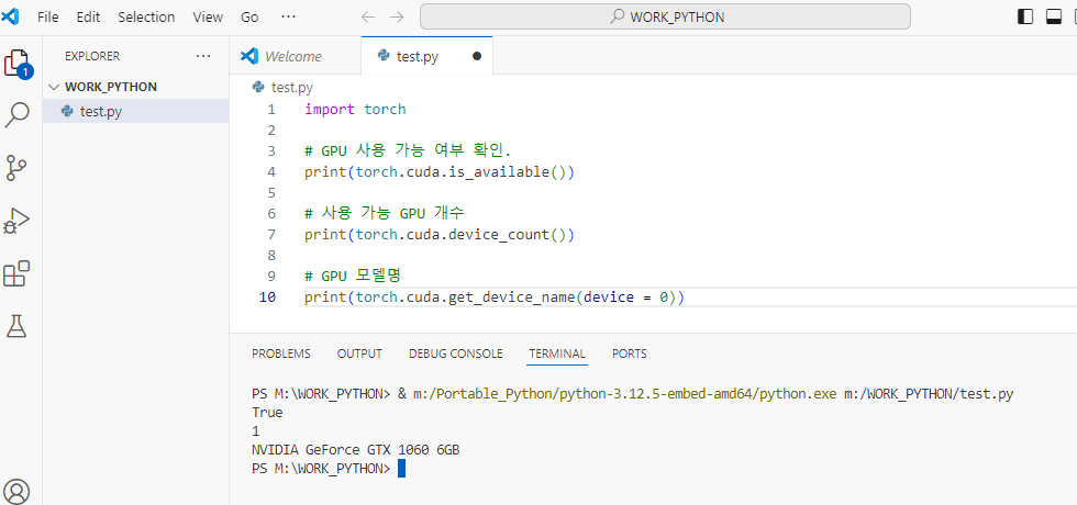 - 앞의 단계1에서 파이썬 IDE 로 설정한 VSCode 실행하여 아래 구문 실행하여 PyTorch 정상 실행 확인.