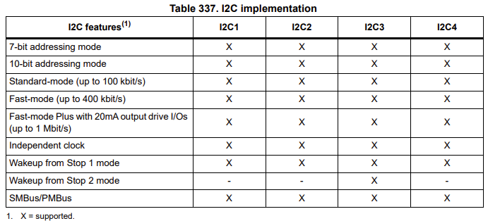아래표. 4개의 I2C 모두 동일한 특성이며, 유일하게 I2C3 만 Stop1 or Stop2 mode 에서 wakeup 가능. 나머지 3개는 Stop1 모드에서 wakeup 가능.