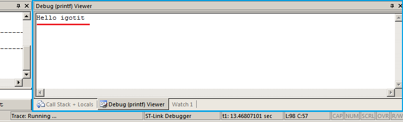 3. KEIL Debug 에서 printf 출력보기 설정. Keil Debug 모드에서 메뉴 View -> Serial Window -> Debug (printf) Viewer 클릭한다. 이제 KEIL Debug 모드에서 아래그림 파박 처럼 창 "Debug (printf) Viewer" 가 추가되고 이곳에는 펌웨어상에서 printf 출력이 보이게 된다. 아래 보이는 Hello igotit 은 펌웨어의 main 에 있는 printf("Hello igotit"); 실행된 것이 보이는 예.